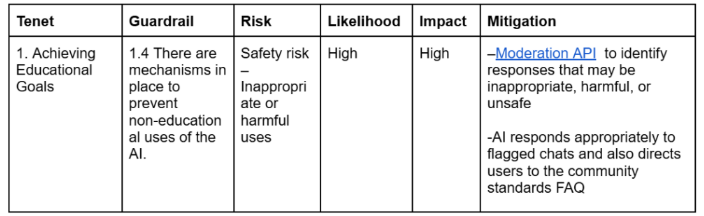 Caption: Table 1. Example of the spreadsheet created and used by Khan Academy. Source: Khan Academy’s Framework for Responsible AI in Education, by Khan Academy, April 3, 2025, Khan Academy Blog. © 2025 Khan Academy. All rights reserved. Not covered by the CC BY 4.0 International license of this content piece. You can view the full text from the table in the file provided here.